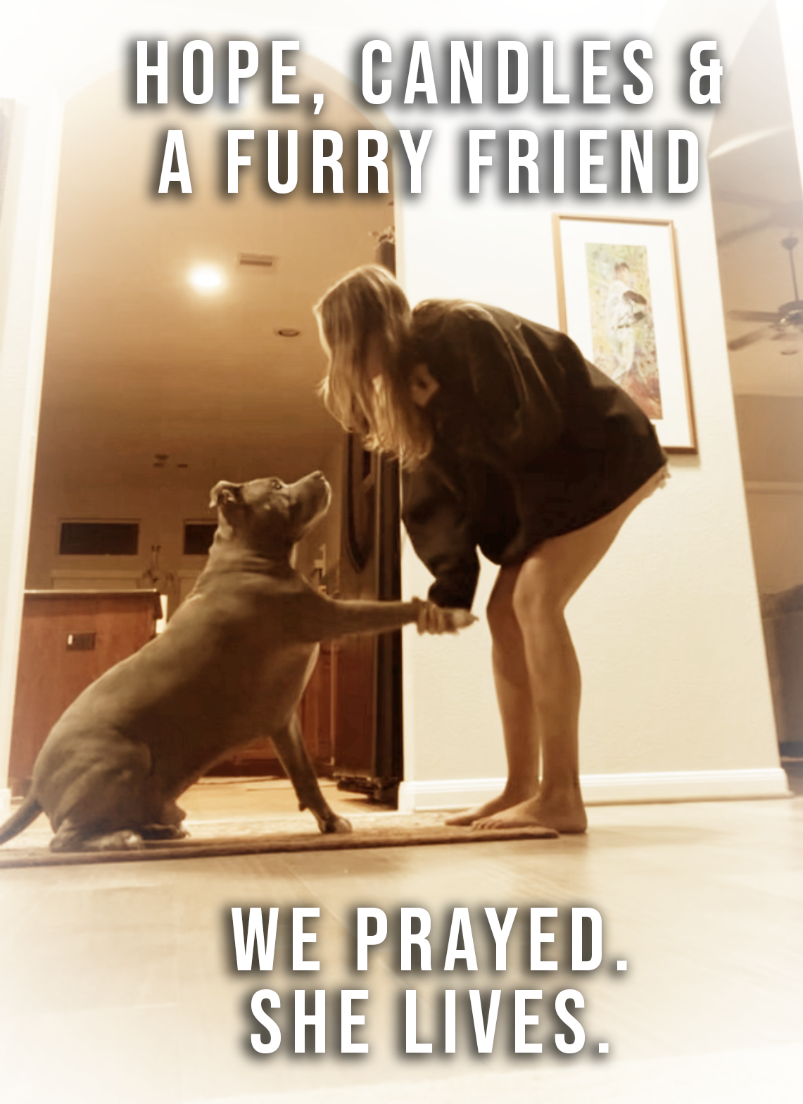 Three years later, my mother was diagnosed with an incurable disease and given 3 months to live. I heard a voice within again point me to my dog and the candles. So, we began passing out candles with little notes to strangers and asking them to “light a flame of faith” and pray for my mother. She still lives today (3 years later) and even works 2 jobs.